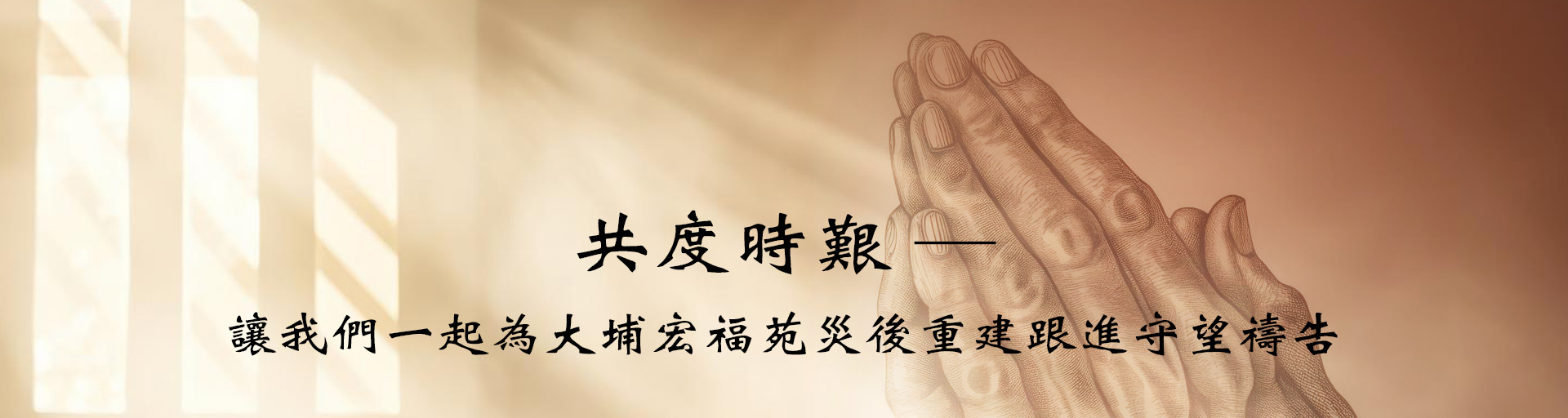 神啊!深明這次災後重建並非短期工程,不單需要重建家園,更需要重建心靈,全城一起走過這條療癒之路。願天父的恩典臨在醫治每一個受傷的肉體與心靈。願傷者早日康復,災民的生活循序復常,經歷創傷的心靈適時復元。奉主耶穌基督名求,阿們!